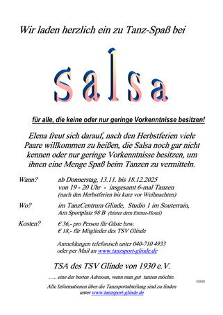 Ab 4. November kann man an 4 aufeinander folgenden Freitagen jeweils von 19 - 20.15 Uhr wieder richtig Discofox-Tanzen lernen oder vergessene Kenntnisse auffrischen. Der Kreis wird auch diesmal von unserer Doris Bahr geleitet, die unter doris.bahr@mail-tanzsport-glinde.de oder Telefon 04104 – 80679 gern Anmeldungen entgegennimmt. Der Kostenbeitrag für diesen Kursus ist € 60 pro Paar, TSA-Mitglieder zahlen nur € 30.